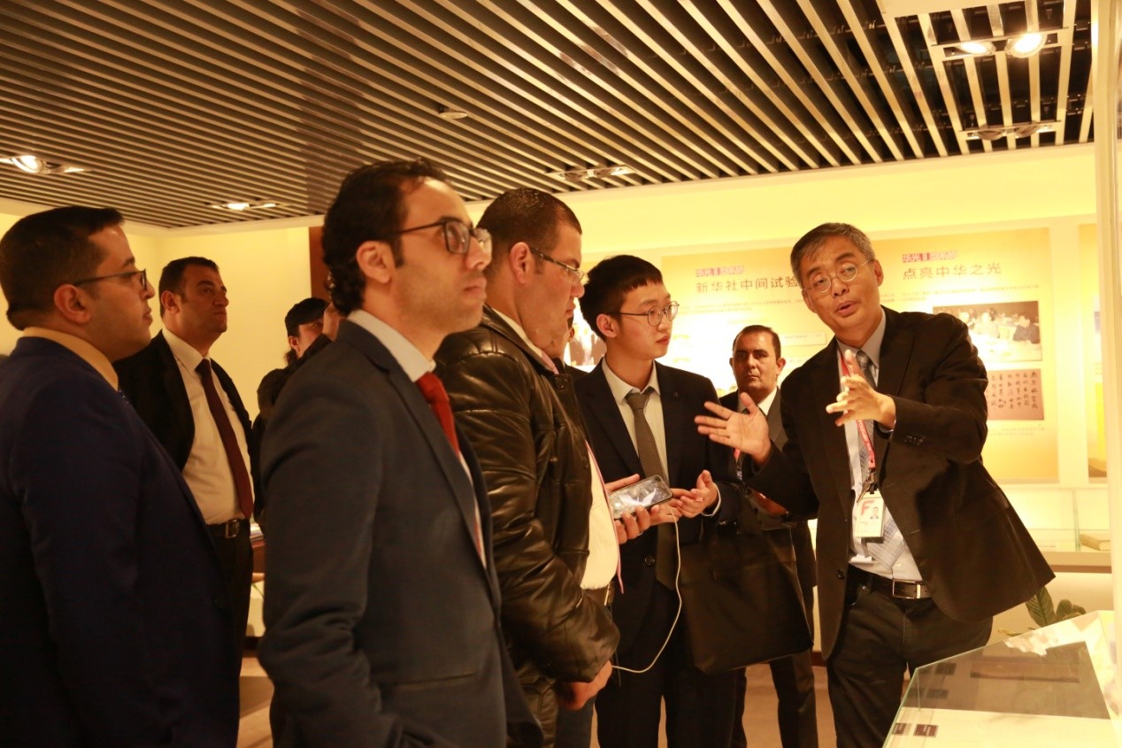 在北大方正信產(chǎn)集團副總裁邵行的帶領下,埃及媒體團參觀了位于方正大廈的王選紀念陳列室。邵行副總裁為大家介紹了由王選首創(chuàng)的“漢字激光照排系統(tǒng)”,使中國印刷業(yè)“告別鉛與火,迎來光和電”,從而展現(xiàn)我國漢字信息處理和印刷技術(shù)革命的光輝歷程。