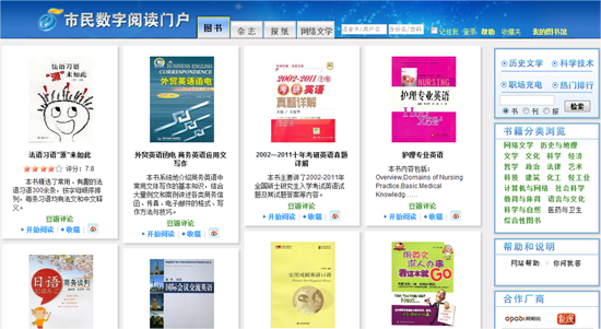 上海圖書館在上海圖書館建館60周年之際,上海圖書館推出“上海市民數(shù)字閱讀推廣計(jì)劃”,2012年主題是“館藏?cái)?shù)字資源介紹及新技術(shù)體驗(yàn)互動”。據(jù)介紹,該閱讀平臺為上海市民數(shù)字閱讀的統(tǒng)一入口,讀者證登錄一次即可使用網(wǎng)站的所有資源,不分卡的功能權(quán)限。資源上包括50萬冊方正電子書、400余種方正數(shù)字報、1000余種時尚期刊及多種多媒體館藏精品,并且資源會在首頁上動態(tài)滾動呈現(xiàn)。