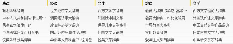主要收錄國(guó)內(nèi)各大出版社各個(gè)領(lǐng)域的權(quán)威工具書,目前已經(jīng)收錄了《中國(guó)大百科全書》、《漢語大詞典》、《辭?!返葯?quán)威工具書;